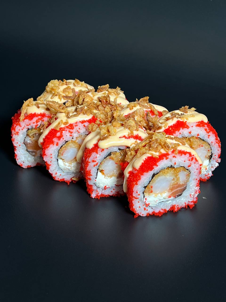 Smažená kreveta, losos, sýr Philadelphia, masago, tobiko mayo, smažená cibulka